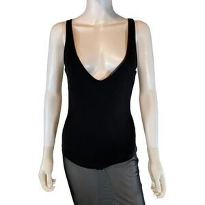 Charlotte Russe One-piece Dress. Bodycon fit with a solid black one-piece that buttons closed and a sheer, knee-length outer layer. Good, gently worn condition.