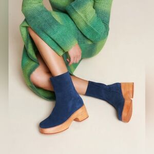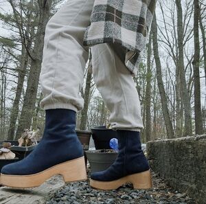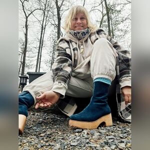 Stylish blue ankle boots. Features a chunky tan sole. Perfect for any occasion.