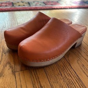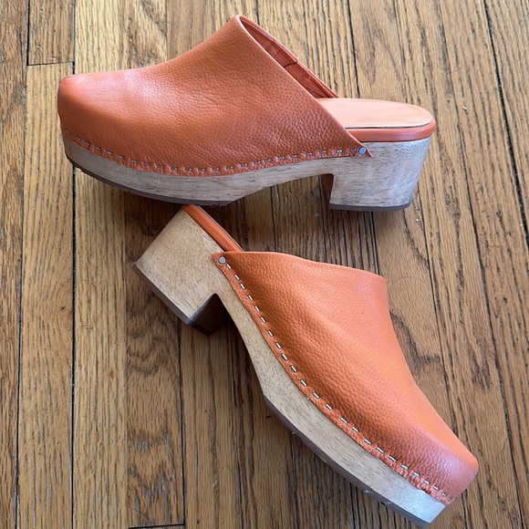 Pebbled orange leather clogs from Charlotte Stone. Pre-worn but comes in good condition, with box. Size 10 with wooden sole.