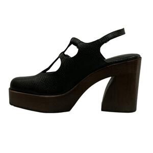 Elevate your modern vintage wardrobe with these Charlotte Stone Gael Platform Mary Jane Heels in classic black. Crafted from embossed leather with a subtle lizard texture, these bold block heels blend retro-inspired design with a modern edge. The chunky wooden-look heel and platform add dramatic height while maintaining comfort and balance. Three adjustable gold buckle straps and a slingback design complete the statement silhouette, perfect for fashion-forward, confident styling.