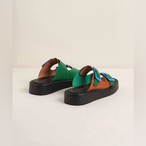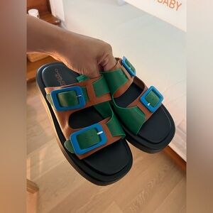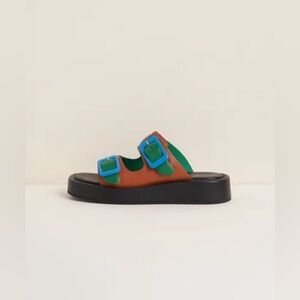 A flatform sandal in blue multi colorway. All leather upper in contrasting colors with covered fully adjustable buckles, super comfortable footbed, 1.5" platform.
