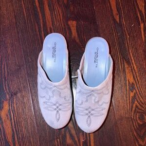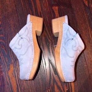 Charlotte Stone Light Blue Embroidered Rios Suede Clogs