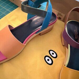 Bold and playful Charlotte Stone sandals featuring a stunning mix of bright, color-blocked leather straps. With a unique mismatched color design โ yellow, orange, pink, purple, blue, and teal โ these sandals are a statement piece for any outfit.