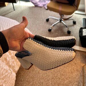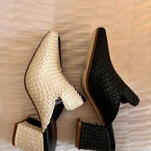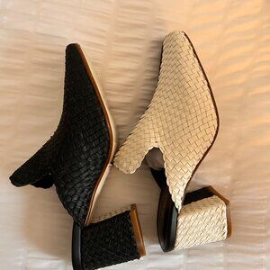 Brand new, never worn: Gorgeous woven black/white Charlotte Stone block heel slides- they were a sample sale and cannot be returned. I ordered a size 9 but they are more of a size 8 narrow fit.