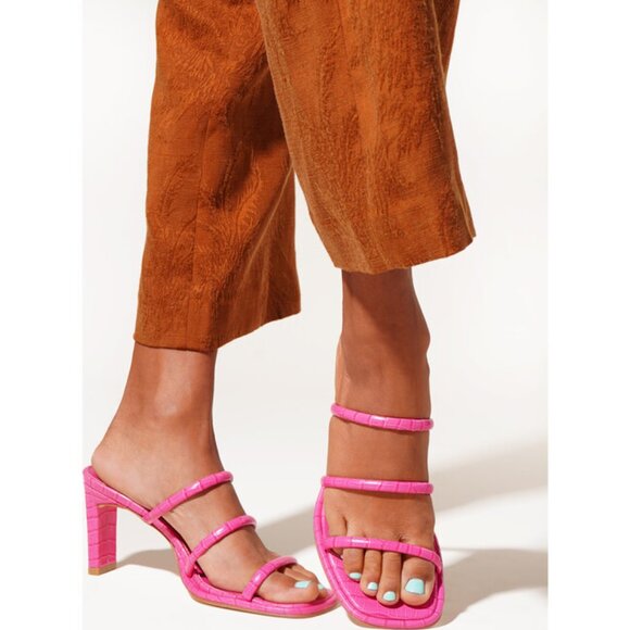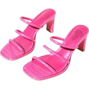 Charlotte Stone Zuma Open-Toe Low Heel Sandal in Fandango Pink 10. Easy everyday low heel sandal. Open toe crocco-embossed leather low heel. Comfy sandal by Charlotte Stone.