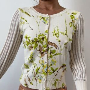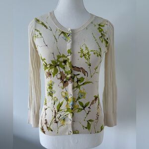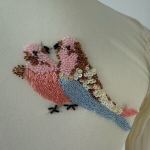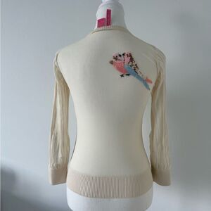 Unique and elegant button down sweater with shear back and beaded bird detail. In great condition.