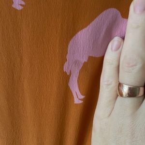 Adorable party dress by Charlotte Taylor. Orange with pink camel print. Back zipper, slightly longer in front with pleats flowing below an empire waist. Shoulder straps include hidden snaps to hide bra straps. Small mark on chest - see photos for details. Size 0 but runs big.