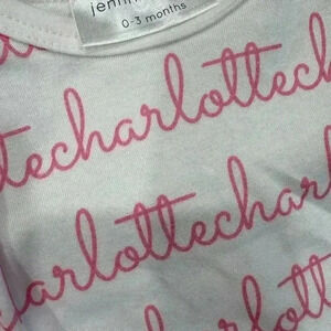 Brand new! Did not come with tags. Jennifer Ann Style organic cotton baby gown. So cute for name announcement, hospital, or newborn photos. Pink and white cursive font with polka dot print on back