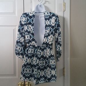Charlotte Russe blue white tie dye partial open back romper Sz M NWOT