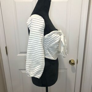 Charlotte Russe front tie cold shoulder crop top with attached long sleeves is white with black pinstripes throughout. Stretchy for a good fit. Size large, sleeve 17.5, pit to pit 17in, length 7.5. ⭐️⭐️