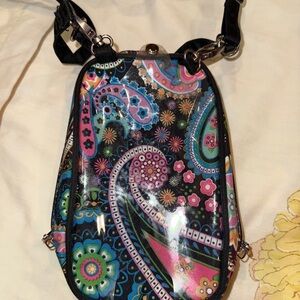 This vibrant crossbody bag features a colorful paisley design, perfect for adding a pop of color to any outfit. The bag combines shades of black, pink, and blue, making it a versatile accessory for any wardrobe.