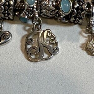 Adorn your wrist with this captivating charm bracelet, a delightful addition to any jewelry collection. This bracelet features a beautiful silver tone chain adorned with an array of intricate charms, including a heart, a letter "K", and a delicate four-leaf flower. The vibrant blue beads add a pop of color and visual interest, while the ornate detailing on the silver-tone beads adds a touch of elegance. Each charm tells a story, making this bracelet a unique and personal accessory. Imagine wearing this bracelet to a casual brunch with friends, a romantic evening out, or even to add a touch of sparkle to your everyday outfit.