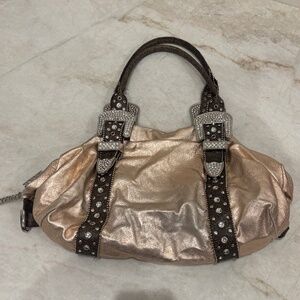 Elevate your accessory game with this stunning Charm & Luck handbag. Crafted from 100% genuine leather, this bag boasts a vibrant shiny pink finish that catches the light beautifully. The standout feature is the Western-style rhinestone-studded buckle on all four sides, adding a touch of glamour and versatility.
