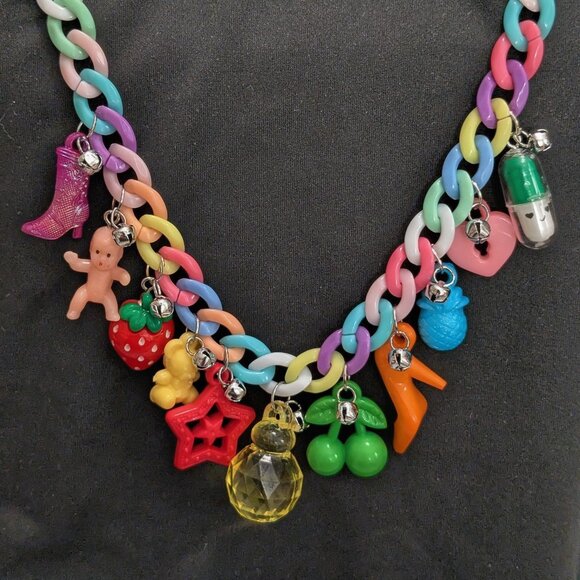 This necklace features fun plastic charms and mini silver bells attached to a colorful plastic chain. Inspired by the plastic charm necklaces kids wore in the 80s/90s. Nostalgic, unique, and handmade with love.
