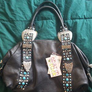 This brand new Charm and Luck Black Leather Handbag has all tags and original plastic on zipper pulls. This purse has turquoise and rhinestones galore. The 4 buckles on the handles make this easily adjustable to the perfect length for any woman.