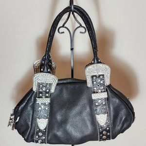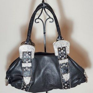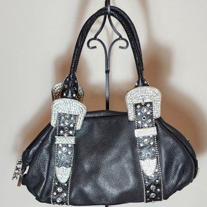 Charm and luck black genuine learher weatern rhinestone buckle handbag