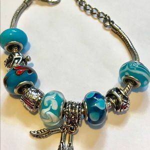 Murano Style Glass Beads featured in blues/white that replicate the hand-blown look of Murano glass from Italy. Alternative with brushed silver-plated beads for an elegant, antique-like design. A small butterfly charm made from sterling silver that dangles from the bracelet adding a whimsical feel. Featuring a silver-plated snake chain-secured with an easy-to-use lobster-claw clasp. 7.5 inches and includes a 1-inch extender, so it offers a great fit on most adult wrists.