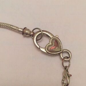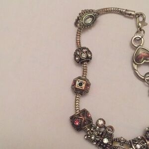 Bracelet has tarnishing and on one of the charms a stone is missing. Charms can be removed.