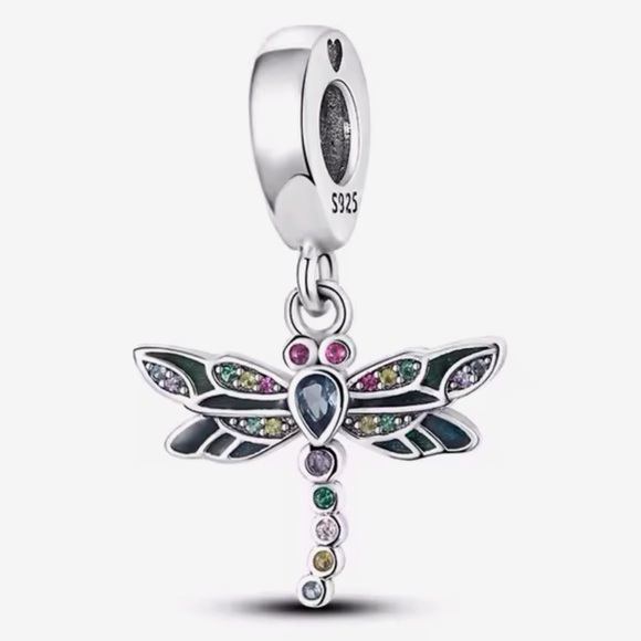 This bracelet charm is of a colorful dragonfly with rhinestones. The charm is sterling silver, S925. This charm is made to fit Pandora bracelets, but not by Pandora. Can be used with similar bracelets.