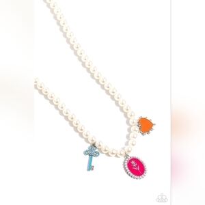 Infused along an invisible string, a collection of gleaming white pearls coalesces below the collar for a refined display. Featuring white rhinestones and dainty pearl accents, three Pink Peacock, orange, and blue painted charms, including a key, rose pendant, and studded heart, dangle below the pearly display for a girly pop of color. Features an adjustable clasp closure.