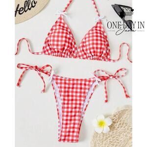 This vibrant red and white bikini brings the beach-day cheer with adjustable ties that fit just right, oh my dear! The cheeky triangle top and matching bottom will make you feel fantastic, stretchy and elastic!