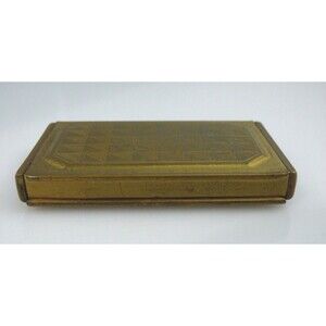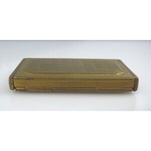 This lovely hard to find, Charmant mirror compact was found at an estate sale. It is made of brass or gold tone metal. It is rectangular in shape and the top is gold tone metal with a nice raised line design and leather in the center. The back has an Art Deco geometric square design and it is signed, "Charmant". The compact opens up to reveal a mirror at the top, and on the bottom a rouge compartment is on the left and a powder compartment is on the right. The original powder puffs are there and there is still rouge and powder remaining in the compartments. The rouge looks almost full. The compact measures approximately 2.70" wide x .42" high x 1.62" deep. Please note that there is some vintage wear on the compact which includes scratches on the leather and on the metal parts on the front, back, and inside. There are some dark places (tarnish/patina) on the compact and some wear and tear on the powder puffs. The mirror is intact with no chips or cracks. It is still in good vintage condition and a very hard to find compact. This would be a wonderful piece to add to your compact collection or place on your vanity table.