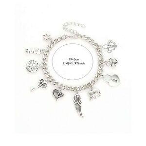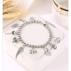 Adorable love and luck silver tone charm bracelet filled with heart charms, angel wings, love and lucky charms. Super cute addition to any collection. Measurements in photos