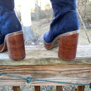 The "Charmed 70s Knee High Boots" by ASOS in size 5 are stylish blue platform boots with a 70s theme. These knee-high boots have a block heel style and are made of faux suede material. They feature an ultra-high heel height, perfect for a party or cocktail occasion.