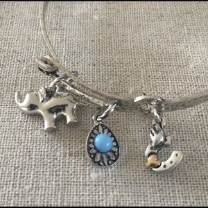 Charmed bangle with elephant and turquoise stone design. Silver. Bangle has textured material.