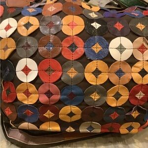 This Charmes large leather bag has every color of the rainbow so it can match any outfit. It has hand straps as well as a long shoulder strap and a zippered closure. The patchwork leather pattern is made by sewing different color circles together over a brown fabric backing. The base and sides of the bag have strips of various colors of leather. The hardware is chrome. The interior of the bag is brown fabric with on zippered pocket and two open pockets.