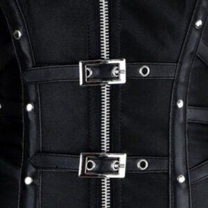 The Charmian Gothic Steampunk Satin Boned Zipper Overbust Corset Top with Buckles is a bold, edgy fashion piece featuring a glossy satin finish, steel boning, with a front zipper closure for easy wear, decorative buckle accents, and a lace-up back for adjustable fit. It’s designed for a dramatic silhouette, ideal for gothic, punk, or festival outfits, and pairs well with skirts, jeans, or leather pants.