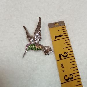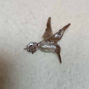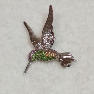 This vintage brooch pin showcases a beautiful Hummingbird design with colorful Rhinestones that add a touch of elegance.