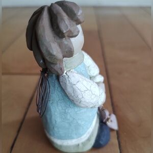 Delight in the charm of this angel figurine, featuring a soothing blue and brown palette. Perfect for adding a touch of serenity to your home decor. Excellent pre-owned condition with no flaws noted. Approximately 3" Height.