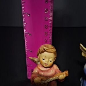 Set of two angel figurines playing guitars. One in pink, the other in blue. Perfect for decoration or collection. He is 3 inches. She is 2 1/2 inches. No cracks or chips.