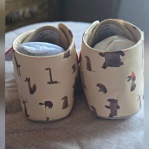 Delightful baby walker shoes featuring a cute animal print and a bold red strap. Ideal for your little one's adventures.
