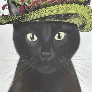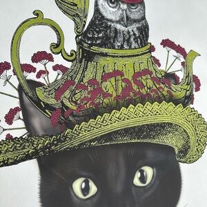 Add a whimsical touch to your home with this charming art print featuring a black cat sitting in a floral hat with an owl. The vibrant red and green floral design adds a pop of color to any room.