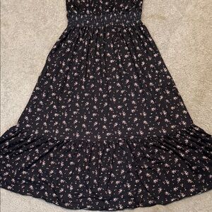 This charming black dress features a delightful floral pattern, perfect for casual outings. Tiered style skirt with elastic waist. Crafted for comfort and style, it's a must-have for your child's wardrobe.