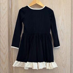 This charming kids dress features a stylish black design with delightful cream bows and trim. Ideal for special occasions.