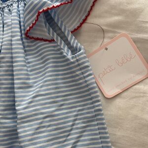 Delight in this charming blue striped dress for kids, featuring vibrant accents. Perfect for casual outings.