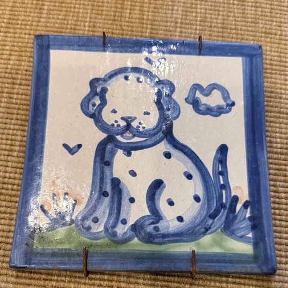 This delightful ceramic tile features a playful animal design in blue and white. Perfect for adding a whimsical touch to your home decor.