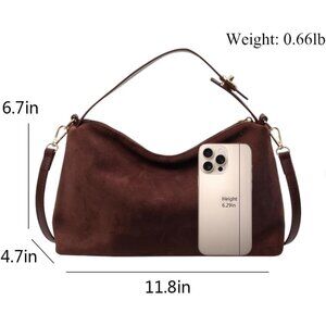 Features: Crafted from soft, premium artificial suede with a textured feel, this roomy tote combines practical storage with a chic vintage vibe. The unique button-top handles let you switch between handbag, shoulder bag, or crossbody styles with ease. A natural, relaxed crescent shape makes it perfect for casual outings, shopping trips, or even work. Zipper closure keeps your essentials secure, while the nylon lining adds a touch of luxury.