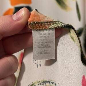 Charming Charlie 3/4 Sleeve Floral Top, size Large. Olive green sleeves and back with multicolor floral print in front middle and at back hemline. 3/4 sleeves, tunic length with hi-low hem. The floral print is 100% rayon (non stretchy) fabric. The olive green is a stretchy knit fabric.