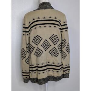 This is a Charming Charlie beige cardigan in size small, featuring an open front and long sleeves. The tight-knit design adds a geometric pattern, perfect for a bohemian or classic style. The material is acrylic, making it machine washable. This cardigan is versatile for travel, casual outings, or business settings, ideal for those who embrace a hippie or cowgirl fashion sense.