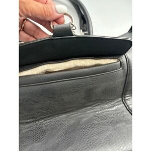 Versatile and stylish satchel handbag by Charming Charlie. Featuring a spacious interior with a patterned lining, multiple compartments, and secure zipper closures. The exterior boasts a classic black faux leather finish with a front flap pocket adorned with a decorative tassel. Silver-tone hardware adds a touch of elegance, while sturdy handles ensure comfortable carrying. Ideal for daily commutes, weekend getaways, or as a chic carry-on during travel.