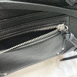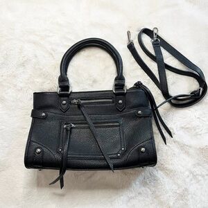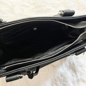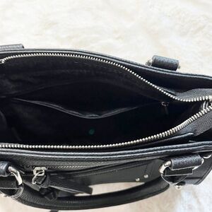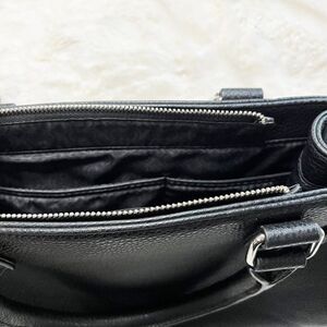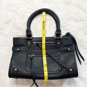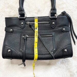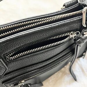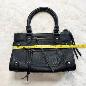 Elegant black satchel with dual handles. Features multiple zippered pockets. Stylish and versatile design.