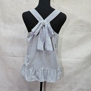 Charming Charlie Blue & White Stripped Ruffle Hem Top with Bow Accent Back Sz S