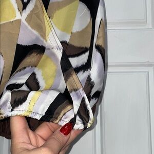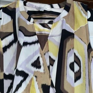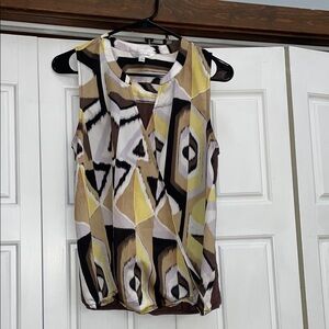 This relaxed sleeveless tank top features a striking geometric pattern in brown and yellow, perfect for adding a modern touch to your outfit. The lightweight fabric drapes beautifully, making it an ideal choice for warm weather.