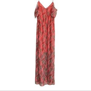 Charming Charlie Cold Shoulder Coral and Brown Retro Leaves Maxi Dress Size M