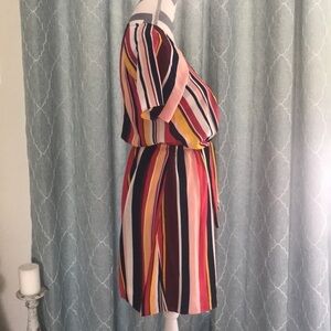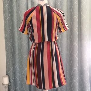 Charming Charlie Colorful Striped Dress with a faux tie in the front. It has a stretchy waist and the skirt part is lined. It is new without tags. Size XS