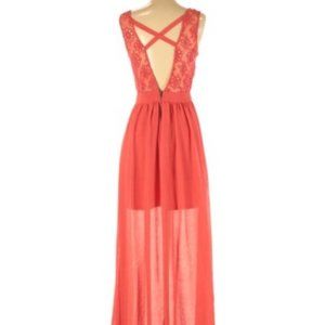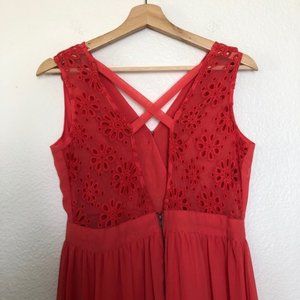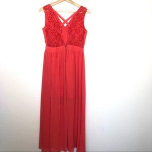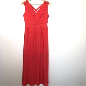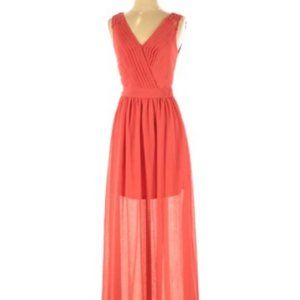 Elegant coral maxi dress. Sleeveless with a V-neckline. Flowy and stylish design.